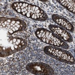 - Immunohistochemical staining of human colon with PMPCA polyclonal antibody (Cat # PAB21437) strong cytoplasmic positivity in glandular cells at 1:50-1:200 dilution.