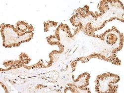 - Immunohistochemical analysis of PTOV1 in paraffin-embedded Human thyroid cancer tissue using (left) PTOV1 Polyclonal Antibody (Product # PA5-67569) at a 1:25 dilution and (right) is treated with synthetic peptide. (Original magnification: x200).