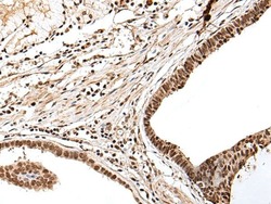 - Immunohistochemical analysis of PTOV1 in paraffin-embedded Human gastric cancer tissue using (left) PTOV1 Polyclonal Antibody (Product # PA5-67569) at a 1:25 dilution and (right) is treated with synthetic peptide. (Original magnification: x200).