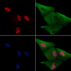 - Immunocytochemistry analysis of EMX2 in A549 cells. The samples were fixed with PFA and permeabilized in 0.1% Triton X-100, then blocked in 10% serum for 45 minutes at 25°C. Samples were incubated with EMX2 polyclonal antibody (Product # PA5-103315) and mouse anti-beta tubulin antibody for 1 hour at 37°C. An AlexaFluor594 conjugated goat anti-rabbit IgG(H+L) (Red) and an AlexaFluor488 conjugated goat anti-mouse IgG(H+L) (Green) were used as the secondary antibodies. The nuclear counter stain is DAPI (blue).