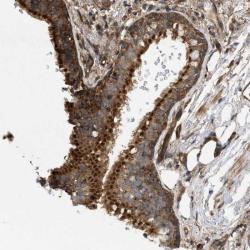 - Immunohistochemical staining of human bronchus shows strong cytoplasmic positivity in respiratory epithelial cells.