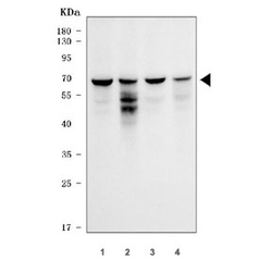 - Western blot testing of human 1) RT4, 2) HaCaT, 3) SiHa and 4) A431 cell lysate with TRIM29 antibody. Predicted molecular weight ~66 kDa.