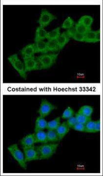 - Immunofluorescence analysis of methanol-fixed HepG2, using Calcium binding protein P22(TA308146) antibody at 1:200 dilution.