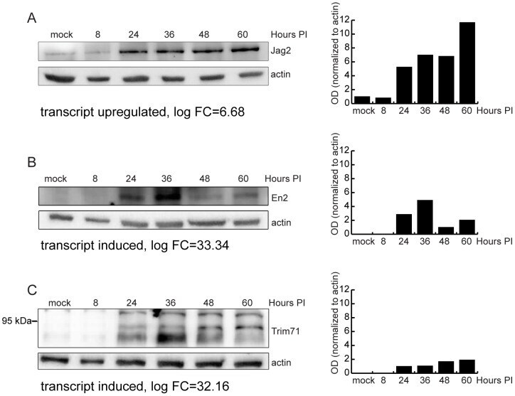 - Figure 6 Validation of RNA-Seq analysis of host genes by western blot. (A) Immunoblot analysis of MEF.K (A) or Balb/c MEF (B-C) cell lysates infected with wild-type MCMV. Cell lysates were separated by SDS-PAGE, transferred to PVDF membrane, and probed with antibody to Jag2 (A), EN2 (B) or Trim71 (C). Monoclonal antibody to actin was used as loading control. Bar charts represent relative quantification of proteins. In the case of Trim71 (C where anti-Trim71 antibody detected multiple bands, the bars show quantification of the middle band.