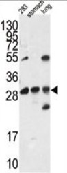 - Western blot analysis of EN2 antibody (C-term) in 293 cell line lysates and mouse stomach and lung tissue lysates (35ug/lane). EN2 (arrow) was detected using the purified Pab.