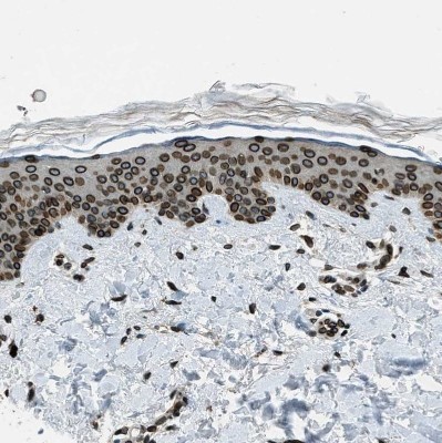 - Immunohistochemistry-Paraffin: LEMD2 Antibody [NBP1-85175] - Staining of human skin shows moderate to strong positivity in nuclear membrane in squamous epithelial cells.