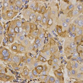 - Immunohistochemistry of paraffin-embedded human liver cancer tissue using ABCC5 antibody at dilution of 1:200 (x400 lens)