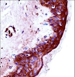 - KLK9 Antibody immunohistochemistry of formalin-fixed and paraffin-embedded human skin tissue followed by peroxidase-conjugated secondary antibody and DAB staining.