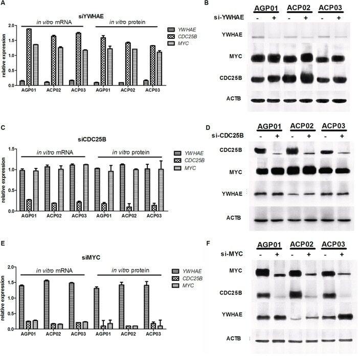 - Figure 2 Effect of gene silencing in gene and protein expression in gastric cancer cell lines A. YWHAE silencing induced MYC and CDC25B increased expression in GC cell lines. B. GC cells with (+) or without (-) YWHAE silencing, equal amounts of whole cell extracts were analyzed by western blot with the indicated antibodies. C. CDCD25B silencing did not alter MYC and YHWAE expression in GC cell lines. D. GC cells with (+) or without (-) CDC25B silencing; Equal amounts of whole cell extracts were analyzed by western blot with the indicated antibodies. E. MYC silencing induced the reduction of CDC25B expression and increasing of YHWAE expression in GC cell lines. F. GC cells with (+) or without (-) MYC silencing; equal amounts of whole cell extracts were analyzed by western blot with the indicated antibodies. siRNA control-transfected cells were used as a calibrator. Values of median and IQR are shown.
