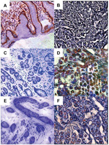 - Figure 8 YWHAE, CDC25B and MYC immunoreactivity in gastric tissue samples A. Non-neoplastic gastric mucosa showing cytoplasmic YWHAE staining. B. intestinal-type gastric cancer cells without YWHAE immunoreactivity. C. Non-neoplastic gastric tissue without CDC25B immunoreactivity. D. Diffuse-type gastric cancer presenting nuclear and cytoplasmic CDC25B immunoreactivity. E. Gastric mucosa without MYC immunoreactivity. F. Intestinal-type gastric cancer presenting nuclear immunoreactivity of MYC.