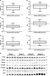 - Figure 9 Protein and gene expression in gastric cancer. A. YWHAE protein expression B. YHWAE mRNA expression. C. CDC25B protein expression. D. CDC25B mRNA expression. E. MYC protein expression. F. MYC mRNA expression. G. Representative image of Western-blot. In all graphs, the expression in gastric tumors was normalized by matched non-neoplastic gastric tissue. T: tumor sample; N: normal mucosa sample; RQ: relative quantification. The whiskers indicate the minimum and maximum values. The dotted lines representes the 1.5 fold-change.