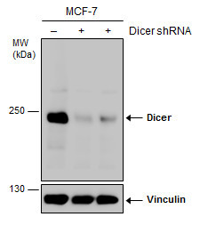 - Non-transfected (¡V) and transfected (+) MCF-7 whole cell extracts (30 ?g) were separated by 5% SDS-PAGE, and the membrane was blotted with Dicer antibody (GTX130536) diluted at 1:1000. The HRP-conjugated anti-rabbit IgG antibody (GTX213110-01) was used to detect the primary antibody.