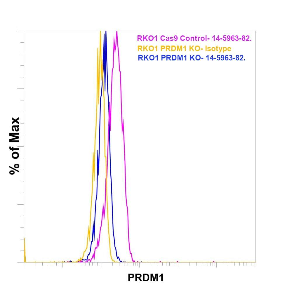 - Knockout of Blimp-1 was achieved by CRISPR-Cas9 genome editing using LentiArray™ Lentiviral sgRNA (Product # A32042, Assay ID CRISPR 965410_LV) and LentiArray Cas9 Lentivirus (Product # A32064). For Flow cytometry analysis, RKO Blimp-1 Knock out cells were stained intracellularly using the Foxp3 / Transcription Factor Staining Buffer Set Buffer Set (Product # 00-5523-00) and protocol, with 5 µg/mL Goat anti-rat IgG2a Secondary Antibody (Product # PA1-84755, yellow histogram) or 5 µg/mL Blimp-1 Monoclonal Antibody (6D3), eBioscience&trade (Product # 14-5963-82, blue histogram) followed by (Product # , 1:1000). RKO Cas9 control cells were also stained similarly with 0.5 mg/mL Blimp-1 Monoclonal Antibody (E.995.1) (Product # 14-5963-82, pink histogram) followed by the secondary antibody. Lossof signal was observed in the Blimp-1 KOcells stained with Blimp-1 antibody clone (E.995.1) but not in the control Cas9cells. Viable cells were used for analysis, as determined by Fixable Viability Dye eFluor™ 780 (Product # 65-0865-18).
