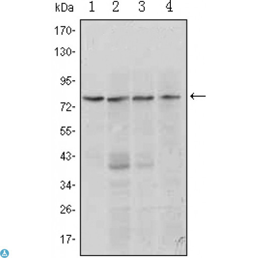 - Western Blot (WB) analysis using Blimp-1 Monoclonal Antibody against Raji (1, 2), L1210 (3) and TPH-1 (4) cell lysate.