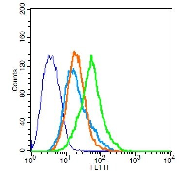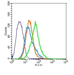 - 293FT cells probed with Rabbit Anti-RAI3 Polyclonal Antibody, Unconjugated (bs-11580R) at 1:20 for 30 minutes followed by incubation with a conjugated secondary (bs-0295G-FITC) (green) for 30 minutes compared to control cells (blue), secondary only (light blue) and isotype control (orange).