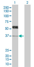 - Western Blot analysis of THPO expression in transfected 293T cell line (H00007066-T01) by THPO MaxPab polyclonal antibody.Lane 1: THPO transfected lysate(38.39 KDa).Lane 2: Non-transfected lysate.