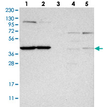 - Western blot analysis of Lane 1: RT-4, Lane 2: U-251 MG, Lane 3: Human Plasma, Lane 4: Liver, Lane 5: Tonsil with MRPL37 polyclonal antibody (Cat # PAB21785).