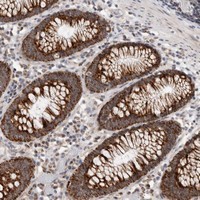 - Immunohistochemical staining of human colon with MRPL37 polyclonal antibody (Cat # PAB21787) strong cytoplasmic positivity in glandular cells at 1:20-1:50 dilution.