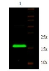 - Immunodetection Analysis: Representative blot from a previous lot. Lane 1.recombinant protein ADIPOQ.The membrane blot was probed with anti-ADIPOQ primary antibody (0.2 µg/ml). Proteins were visualized using a Donkey anti-rabbit secondary antibody conjugated to IRDye 800CW detection system. Arrows indicate recombinant proteinADIPOQ from E.coli cell (15kDa).
