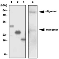 - Western blot analysis of recombinant proteins and mouse liver lysates. To probed with ADIPOQ monoclonal antibody, clone 1G12 (1 : 500) (Cat # MAB1063). Proteins were visualized using a goat anti - mouse secondary antibody conjugated to HRP and an ECL detection system. 1 : Recombinant human ADIPOQ protein (full lenghth). 2 : Recombinant human globular domain of ADIPOQ fusion protein. 3 : Recombinant mouse globular domain of ADIPOQ protein. 4 : Mouse liver lysates. Arrows indicate the oligomer and monomer of ADIPOQ protein.