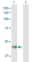 - Western Blot analysis of GPR61 expression in transfected 293T cell line (H00083873-T01) by GPR61 MaxPab polyclonal antibody.Lane 1: GPR61 transfected lysate(49.30 KDa).Lane 2: Non-transfected lysate.