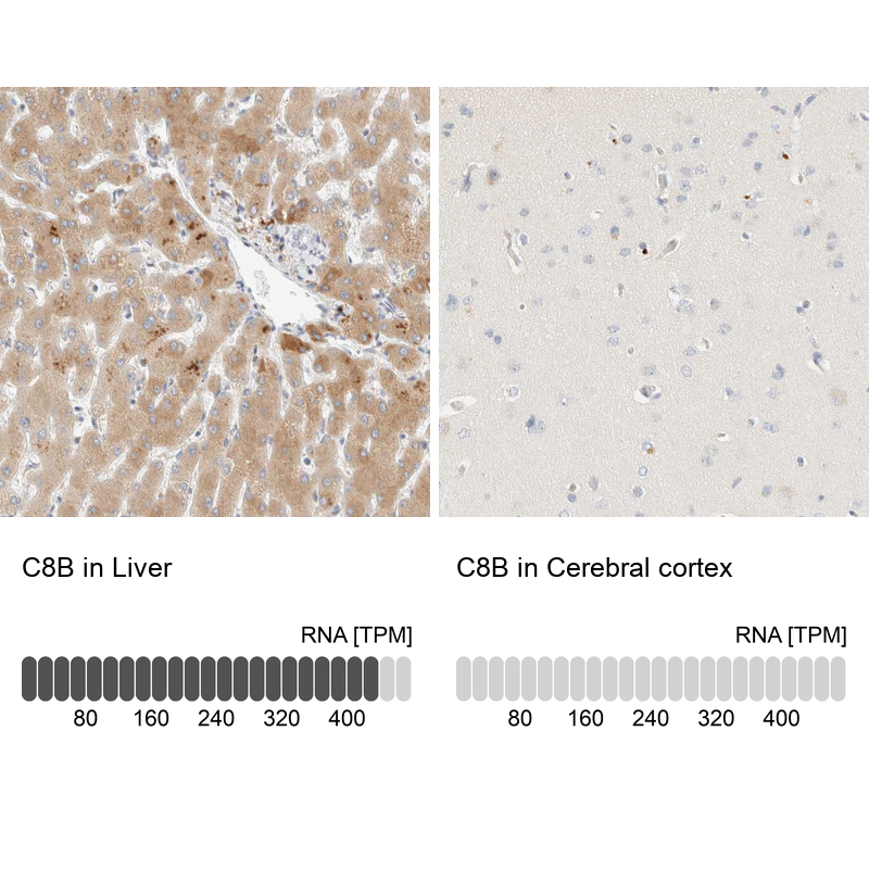 - Immunohistochemistry analysis in human liver and cerebral cortex tissues using HPA023694 antibody. Corresponding C8B RNA-seq data are presented for the same tissues.