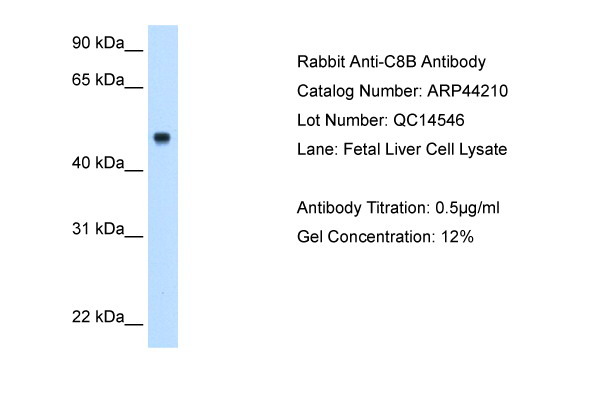 - Western blot analysis using Anti-C8B antibody detects protein at predicted molecular weight using Fetal Liver Tissue as a positive control. Tissue/Lysate Concentration: 0.5ug/ml Antibody Concentration: 1.0ug/ml