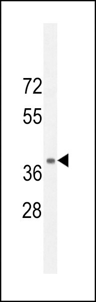 - Western blot analysis of NPSR1 in mouse kidney tissue lysates. Samples were incubated with NPSR1 polyclonal antibody (Product # PA5-24177). Lysates: 35 µg/lane. NPSR1 protein (arrow).