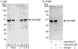 - Detection of human and mouse SAP30BP by western blot (h&m) and immunoprecipitation (h). Samples: Whole cell lysate from HeLa (5, 15 and 50 µg for WB; 1 mg for IP, 20% of IP loaded), 293T (T; 50 µg), and mouse NIH3T3 (M; 50 µg) cells. Antibodies: Affinity purified rabbit anti-SAP30BP antibody A302-833A used for WB at 0.1 µg/ml (A) and 1 µg/ml (B) and used for IP at 3 µg/mg lysate. SAP30BP was also immunoprecipitated by rabbit anti-SAP30BP antibody A302-832A, which recognizes an upstream epitope. Detection: Chemiluminescence with exposure times of 30 seconds (A) and 10 seconds (B).