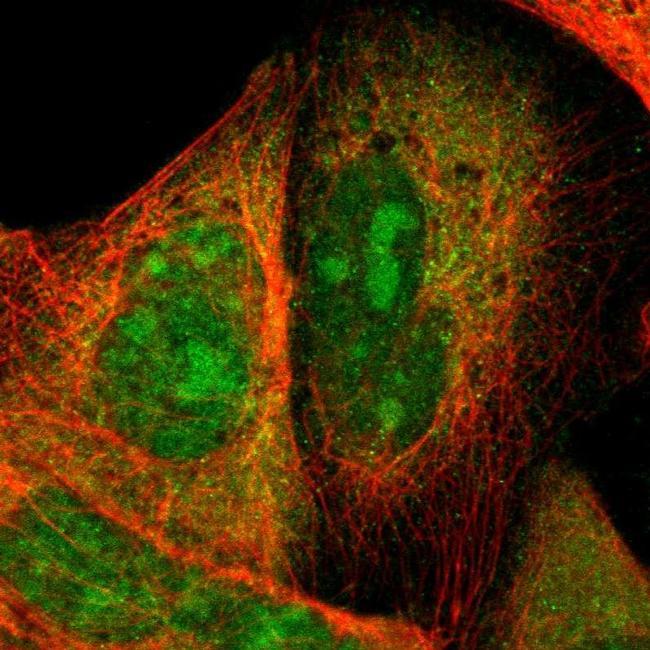 - Immunofluorescent staining of FKBP15 in human cell line A-431 shows positivity in nucleoli & cytoplasm. Samples were probed using a FKBP15 Polyclonal Antibody (Product # PA5-52495).
