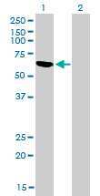 - Western Blot analysis of RBM5 expression in transfected 293T cell line by RBM5 monoclonal antibody (M01), clone 2B6.Lane 1: RBM5 transfected lysate(61.5 KDa).Lane 2: Non-transfected lysate.