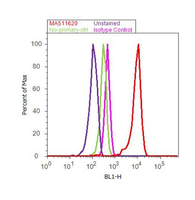- Flow cytometry analysis of Calponin-1 was done on MCF7 cells. Cells were fixed with 70% ethanol for 10 minutes, permeabilized with 0.25% Triton™ X-100 for 20 minutes, and blocked with 5% BSA for 30 minutes at room temperature. Cells were labeled with Calponin-1 Mouse Monoclonal Antibody (Product # MA5-11620, red histogram) or with mouse isotype control (pink histogram) at 3-5 µg/million cells in 2.5% BSA. After incubation at room temperature for 2 hours, the cells were labeled with Alexa Fluor® 488 Rabbit Anti-Mouse Secondary Antibody (Product # A11059) at a dilution of 1:400 for 30 minutes at room temperature. The representative 10, 000 cells were acquired and analyzed for each sample using an Attune® Acoustic Focusing Cytometer. The purple histogram represents unstained control cells and the green histogram represents no-primary-antibody control.