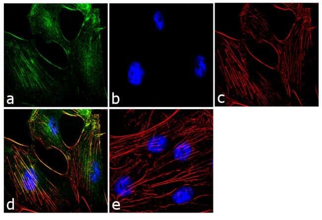 - Immunofluorescence analysis of Calponin-1 was performed using 70% confluent log phase MDA-MB-231 cells. The cells were fixed with 4% paraformaldehyde for 10 minutes, permeabilized with 0.1% Triton™ X-100 for 10 minutes, and blocked with 1% BSA for 1 hour at room temperature. The cells were labeled with Calponin-1 (CALP) Mouse Monoclonal Antibody (Product # MA5-11620) at 2 µg/mL in 0.1% BSA and incubated for 3 hours at room temperature and then labeled with Goat anti-Mouse IgG (H+L) Superclonal™ Secondary Antibody, Alexa Fluor® 488 conj µgate (Product # A28175) at a dilution of 1:2000 for 45 minutes at room temperature (Panel a: green). Nuclei (Panel b: blue) were stained with SlowFade® Gold Antifade Mountant with DAPI (Product # S36938). F-actin (Panel c: red) was stained with Alexa Fluor® 555 Rhodamine Phalloidin (Product # R415, 1:300). Panel d represents the merged image showing localization in the cytoskeleton. Panel e shows the no primary antibody control. The images were captured at 60X magnification.