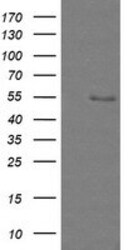 - HEK293T cells were transfected with the pCMV6-ENTRY control (Left lane) or pCMV6-ENTRY ZSCAN18 (Right lane) cDNA for 48 hrs and lysed. Equivalent amounts of cell lysates (5 ug per lane) were separated by SDS-PAGE and immunoblotted with anti-ZSCAN18.