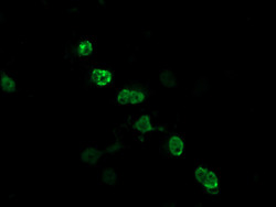 - Anti-ZSCAN18 mouse monoclonal antibody (TA505242) immunofluorescent staining of COS7 cells transiently transfected by pCMV6-ENTRY ZSCAN18(RC203390).