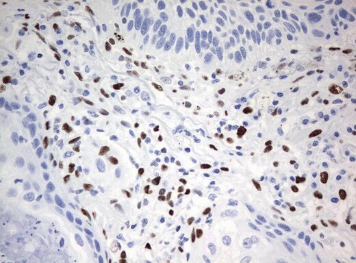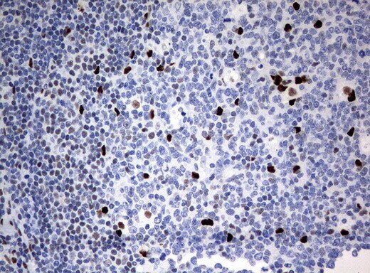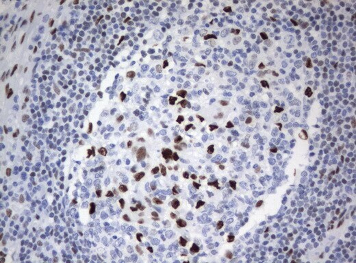 - Immunohistochemical staining of paraffin-embedded human lymph node tissue using anti-ZSCAN18 mouse monoclonal antibody. (UM500081; heat-induced epitope retrieval by 10mM citric buffer, pH6.0, 120°C for 3min)