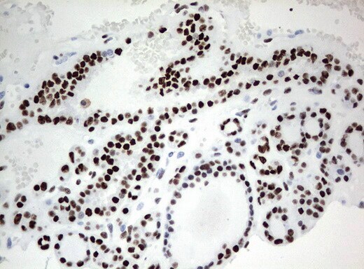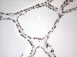 - Immunohistochemical staining of paraffin-embedded human thyroid tissue using anti-ZSCAN18 mouse monoclonal antibody. (UM500081; heat-induced epitope retrieval by 10mM citric buffer, pH6.0, 120°C for 3min)