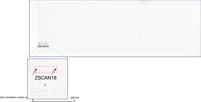 - OriGene overexpression protein microarray chip was immunostained with UltraMAB anti-ZSCAN18 mouse monoclonal antibody (UM500081). The positive reactive proteins are highlighted with two red arrows in the enlarged subarray. All the positive controls spotted in this subarray are also labeled for clarification.