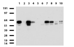 - Western blot of human tissue lysates (15 µg) from 10 different tissues (1: Testis, 2: Omentum, 3: Uterus, 4: Breast, 5: Brain, 6: Liver, 7: Ovary, 8: Colon, 9: Spleen, 10: Thyroid). Dilution: 1:500.