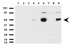 - Western blot of cell lysates (35 µg) from 9 different cell lines (1: HepG2, 2: HeLa, 3: SV-T2, 4: A549. 5: COS7, 6: Jurkat, 7: MDCK, 8: PC-12, 9: MCF7).