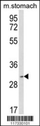 - Western blot analysis of SFRS2 Antibody (Center) in mouse stomach tissue lysates (35ug/lane). SFRS2 (arrow) was detected using the purified Pab.