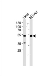 - Western blot of lysates from HeLa cell line and mouse liver tissue lysate(from left to right), using APG4C Antibody. Antibody was diluted at 1:1000 at each lane. A goat anti-rabbit IgG H&L (HRP) at 1:5000 dilution was used as the secondary antibody. Lysates at 35ug per lane.