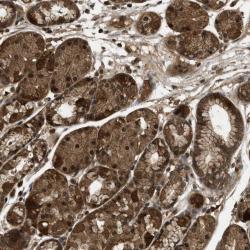 - Immunohistochemical staining of human stomach shows cytoplasmic and nuclear positivity in glandular cells.