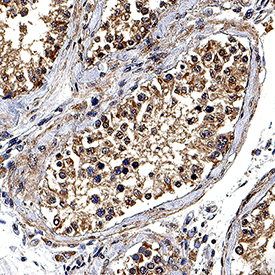 - DNAH17 in Human Testis. DNAH17 was detected in immersion fixed paraffin-embedded sections of human testis using Mouse Anti-Human DNAH17 Monoclonal Antibody (Catalog # MAB9657) at 0.5 µg/mL for 1 hour at room temperature followed by incubation with the Anti-Mouse IgG VisUCyte™ HRP Polymer Antibody (Catalog # VC001). Tissue was stained using DAB (brown) and counterstained with hematoxylin (blue). Specific staining was localized to cytoplasm in sperm cells. View our protocol for IHC Staining with VisUCyte HRP Polymer Detection Reagents.