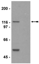 - Immunoblot Analysis: A431 cell lysates were resolved by electrophoresis, transferred to nitrocellulose and probed with anti p125Nap1 (1 μg/ml), Arrow indicates p125Nap1 (125kDa).Lane 1: anti p125Nap1 preincubated with 10μM immunizing peptide.Lane 2. Proteins were visualized using a Goat anti Rabbit secondary antibody conjugated to HRP and a chemiluminescence detection system.