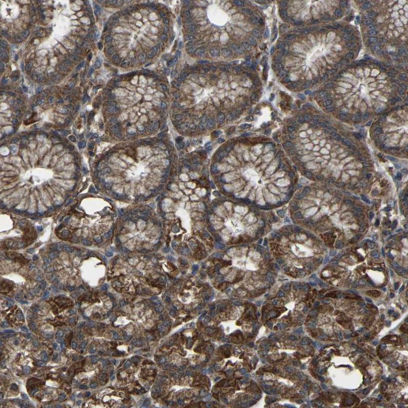 - Immunohistochemical staining of human stomach shows cytoplasmic positivity in glandular cells.