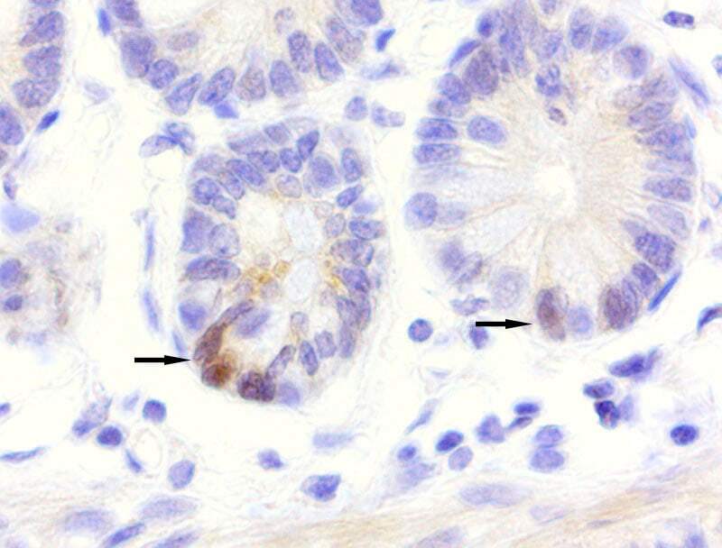 - Immunohistochemical staining of paraffin-embedded human small intestine using anti-LGR5 clone UMAB212 mouse monoclonal antibody used at 1 µg/mL dilution and detection with Polink2 Broad HRP DAB. UM800104 requires heat-induced epitope retrieval with TEE pH 9.0 at 95-100C 20 minutes. The image shows two arrows pointing to strong and weak staining of small intestine stem cells.