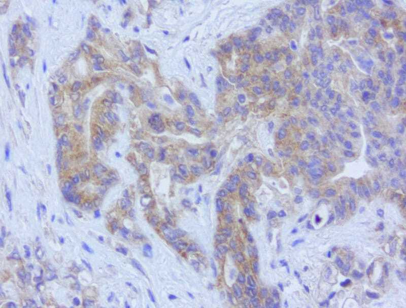 - Immunohistochemical staining of paraffin-embedded Adenocarcinoma of Human colon tissue using anti-LGR5 mouse monoclonal antibody. (Heat-induced epitope retrieval by 1mM EDTA in 10mM Tris buffer (pH8.5) at 110°C for 10 min, UM800104)(1:150)