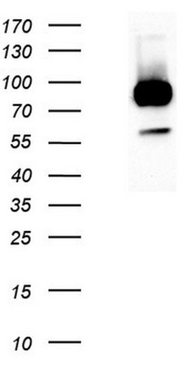 - Western blot analysis of extracts (15 µg) from 2 Human tissue by using anti-LGR5 monoclonal antibody (left lane: Brain right lane: Testis). (1:2000)