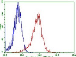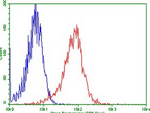 - Flow cytometric analysis of stable expression LGR5(RC212825) HEK293T cells (Red) compared to negative control HEK293T cells (Blue) using anti-LGR5 antibody (UM800104, 1:100) surface stained on live cells.